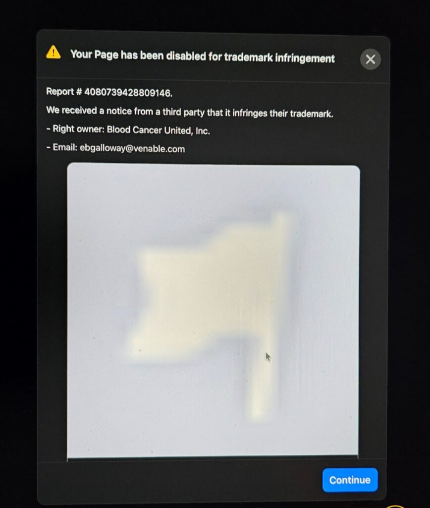 Fraudulent Takedown Notice: LLS knowingly filed a false copyright/trademark infringement claim with Meta Platforms, Inc. to have the “Lights Over America” Facebook page (the original “Light The Night” page) removed. We possess direct evidence from Meta confirming LLS initiated this takedown.
