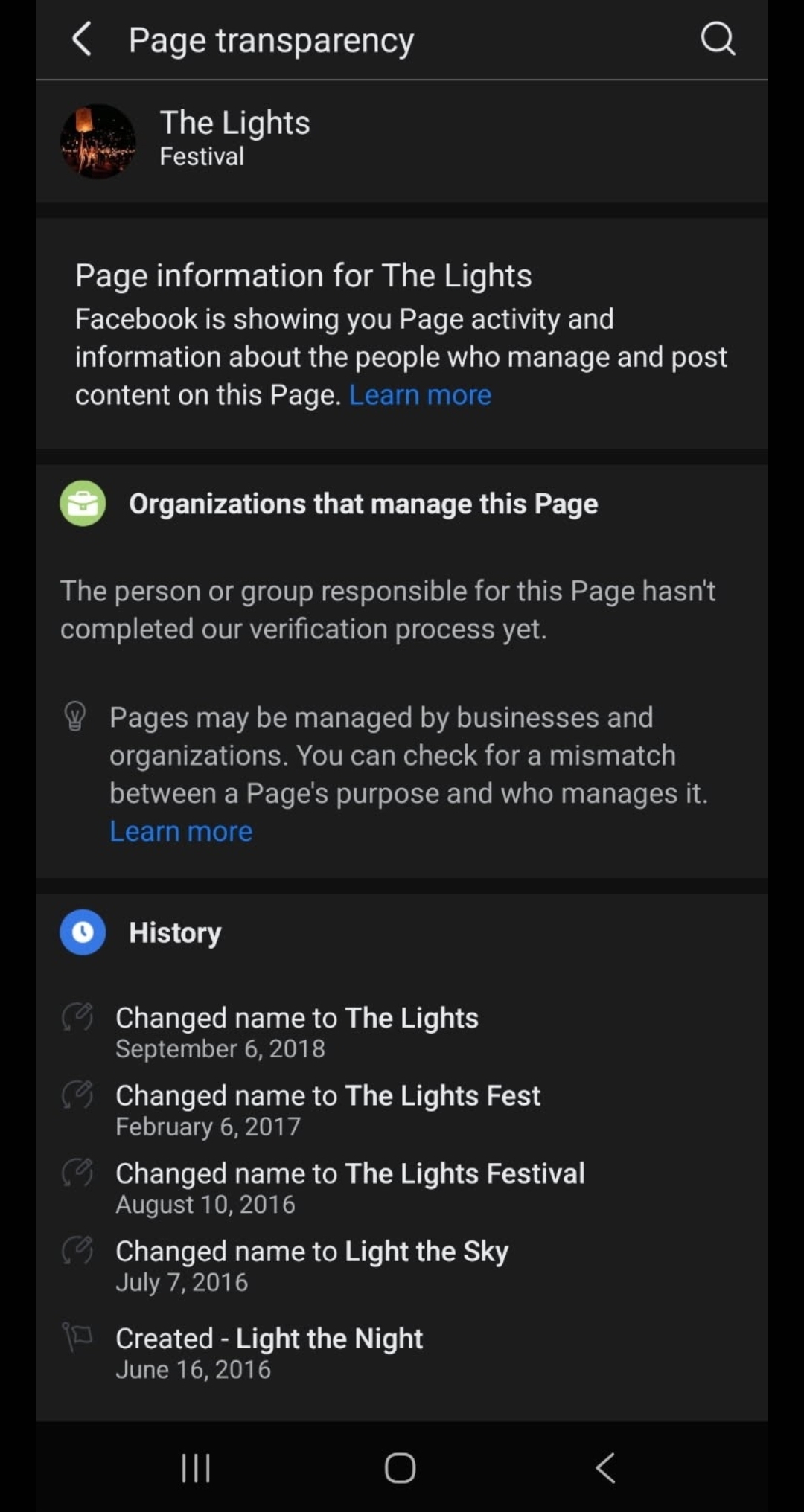 We want to point out that we have additional proof of targeted harassment of just LOA. If you look at the lights fest Facebook account in page transparency you will see they also first named their Facebook Light The Night. You know what's still up? the lights fest page as you can see below. That shows targeted harassment.